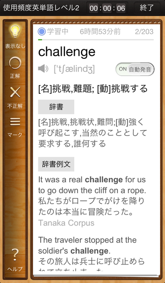 このアプリの便利なところはただ単語の意味がわかるだけではなく、例文も載っているのでどのようなシチュエーションで使うかも知ることができて、より実践的な学びができるところです。登録してアプリを利用すると、「本日学習」や「累計学習」で何時間勉強したかを記録でき、「勤勉度」や「レベル」も示してくれるので、思ったよりも英語力がない、思いのほか実力がついてきた、など自分のレベルを客観的に知ることはできます。